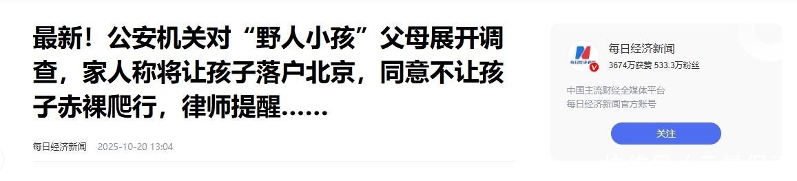 信息来源:每日经济新闻2025-10-20:最新!公安机关对“野人小孩”父母展开调查,家人称将让孩子落户北京,同意不让孩子赤裸爬行,律师提醒……