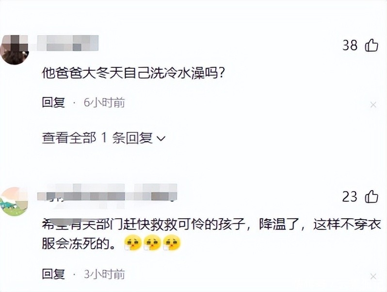 有网民质问:“自己都懂得穿衣遮体,为何不能为孩子也穿上衣服?现在早已不是夏季,难道不怕生病吗?”